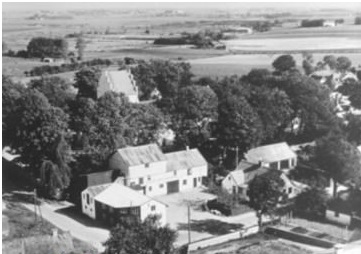 Luftfoto af Motormøllen med kirketårnet i baggrunden. I forgrunden ses Skyttegårdens mødding. 1948-1952